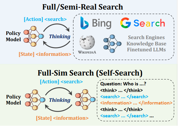 The authors of SSRL: Self-Search Reinforcement Learning dispense with this complexity: they don’t care about the content of retrieved documents at all - they mask (exclude from loss calculations) answers’ content. They only care about the process: how to teach the model to use a search engine. They do this by structuring the text with think, search, and information tags. The model “thinks”, then searches, then processes the information retrieved, and the cycle repeats.